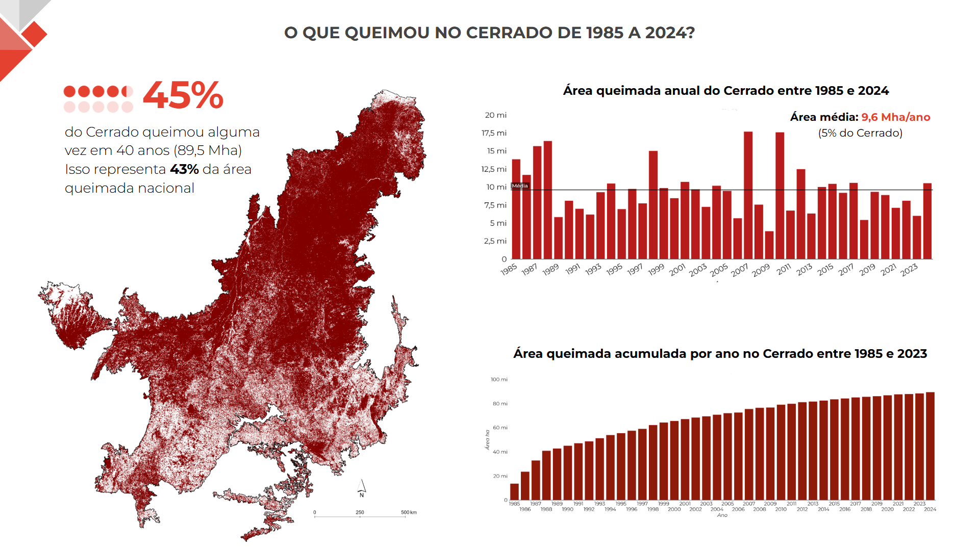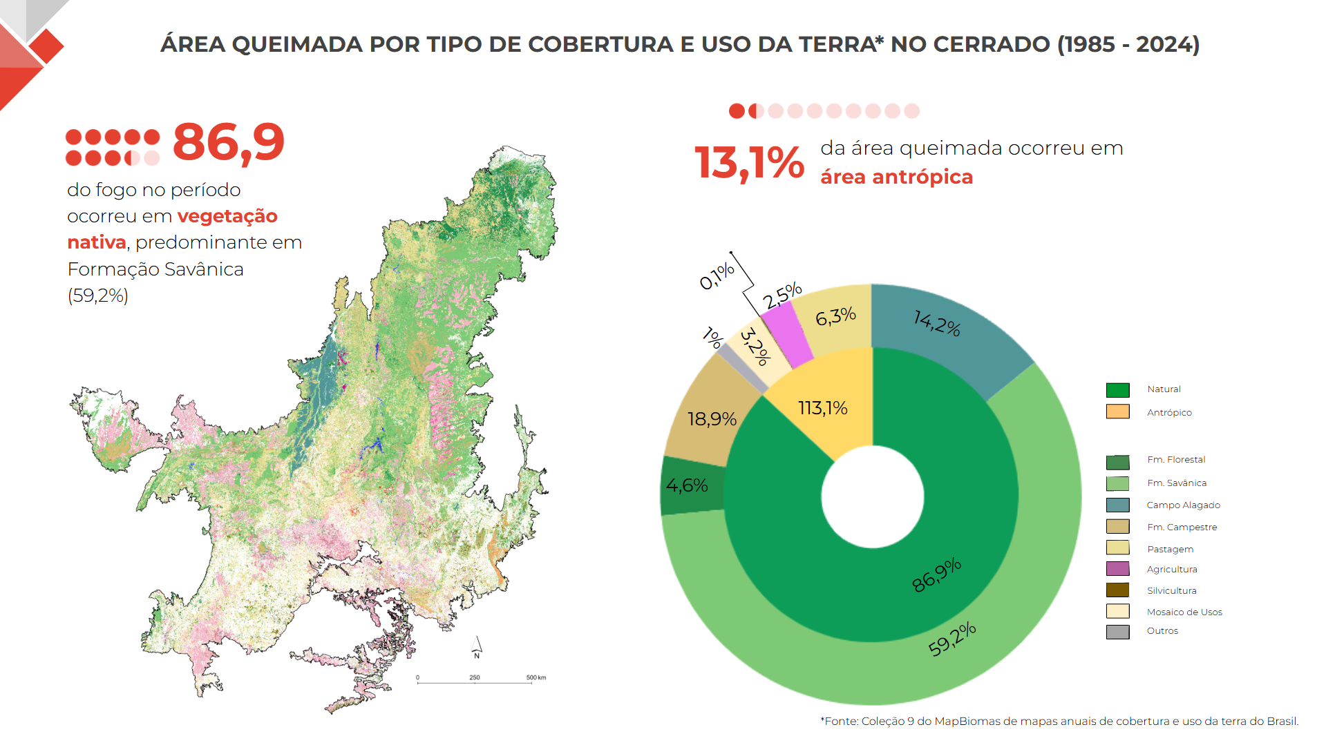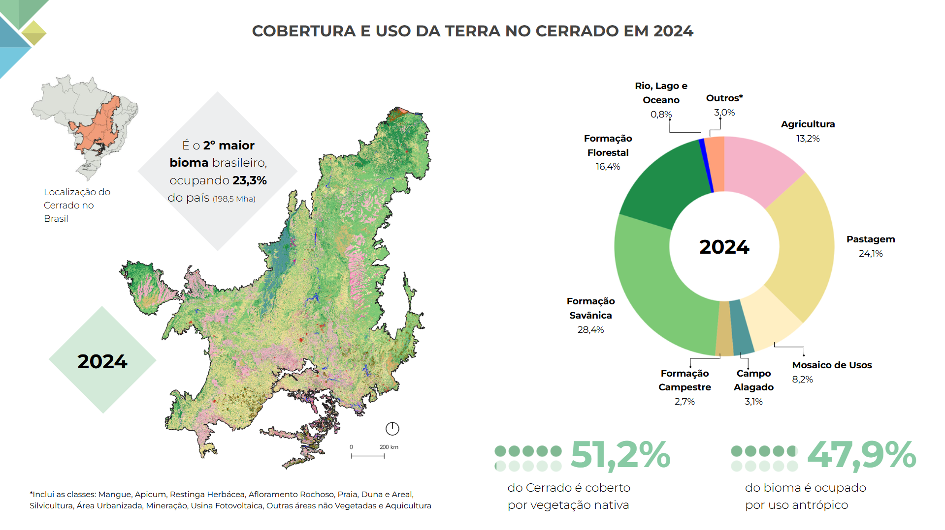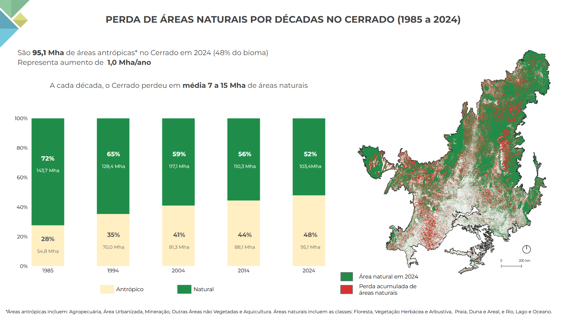 Ainda segundo o MapBiomas, o Cerrado perdeu 26,5 milhões de hectares, ou 20%, de sua vegetação nativa desde 1985. Isso equivale a uma área maior que o estado do Piauí. No mesmo período, a agropecuária ocupou uma área quase complementar: foram 26,2 milhões de hectares destinados à atividade. Hoje, a agropecuária ocupa 44,2% do Cerrado. Em 36 anos, o Cerrado foi o bioma mais atingido por incêndios, concentrando cerca de 44% da área queimada do Brasil.